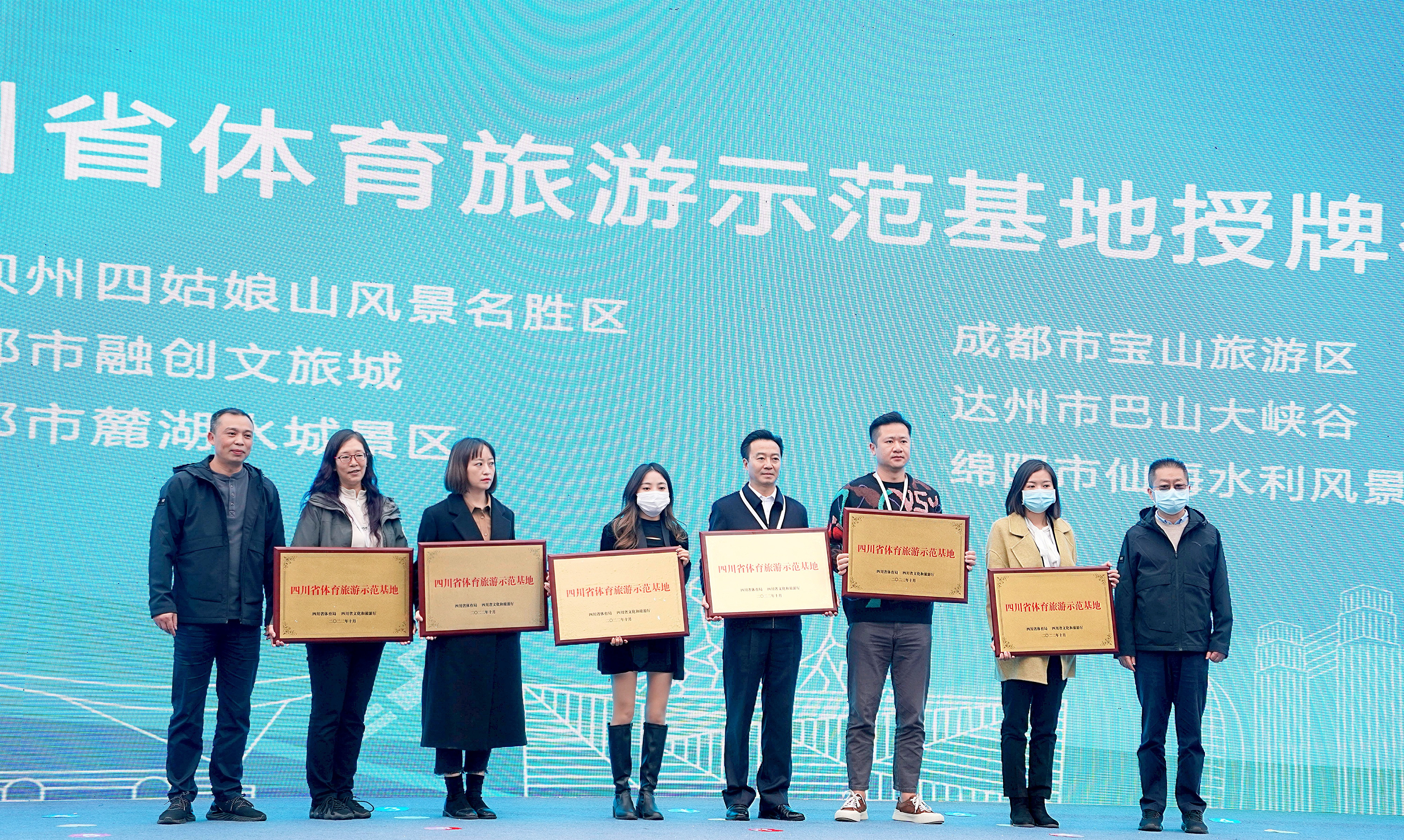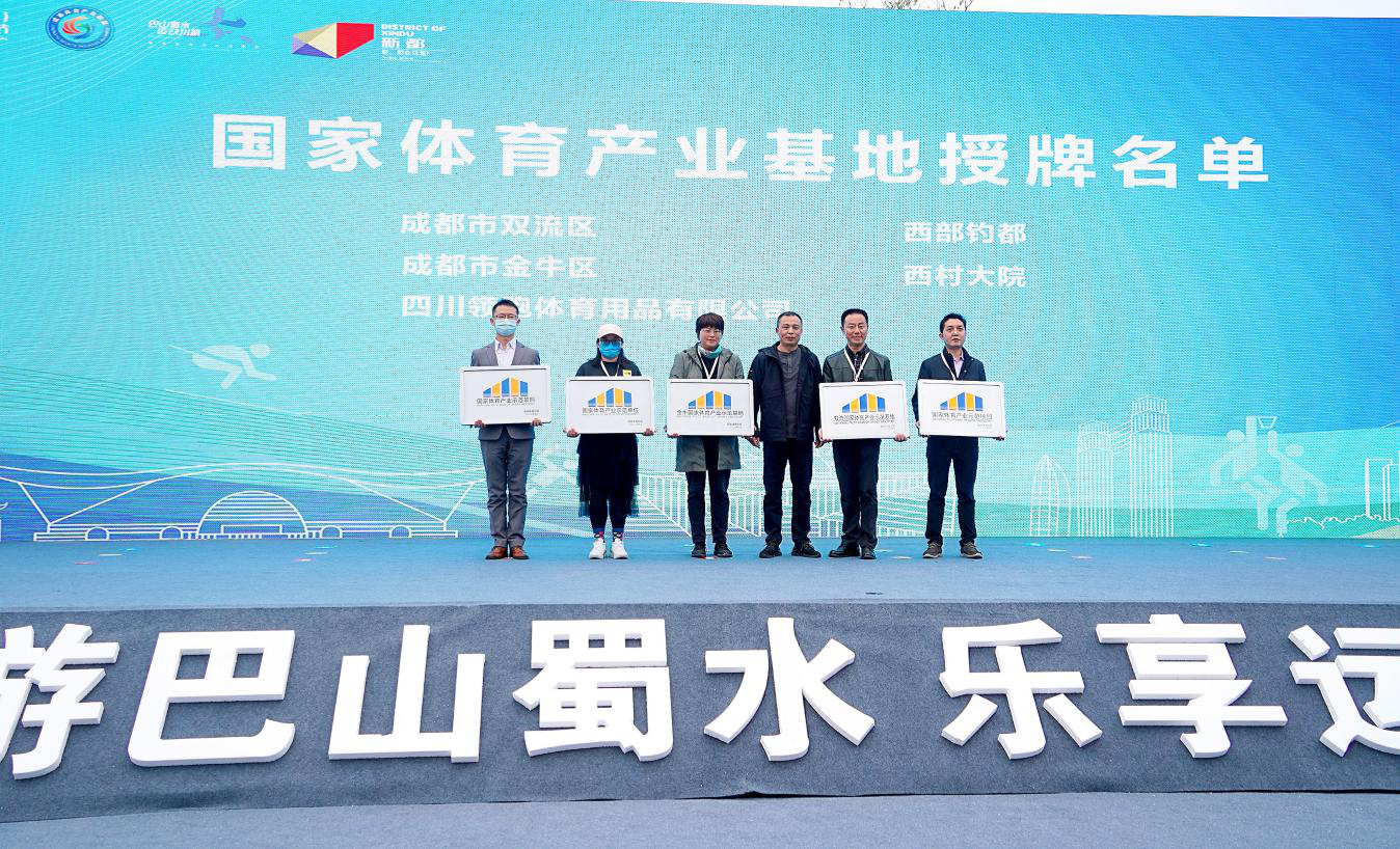 开幕仪式现场,四川省体育局代国家体育总局对荣获“国家体育产业示范基地”称号的成都市双流区、成都市金牛区,荣获“国家体育产业示范单位”称号的四川领跑体育用品有限公司,荣获“国家体育产业示范项目”称号的西部钓都、西村大院授牌。四川省体育局、四川省文化和旅游厅为阿坝州四姑娘山风景名胜区等6家首批四川省体育旅游示范基地授牌。