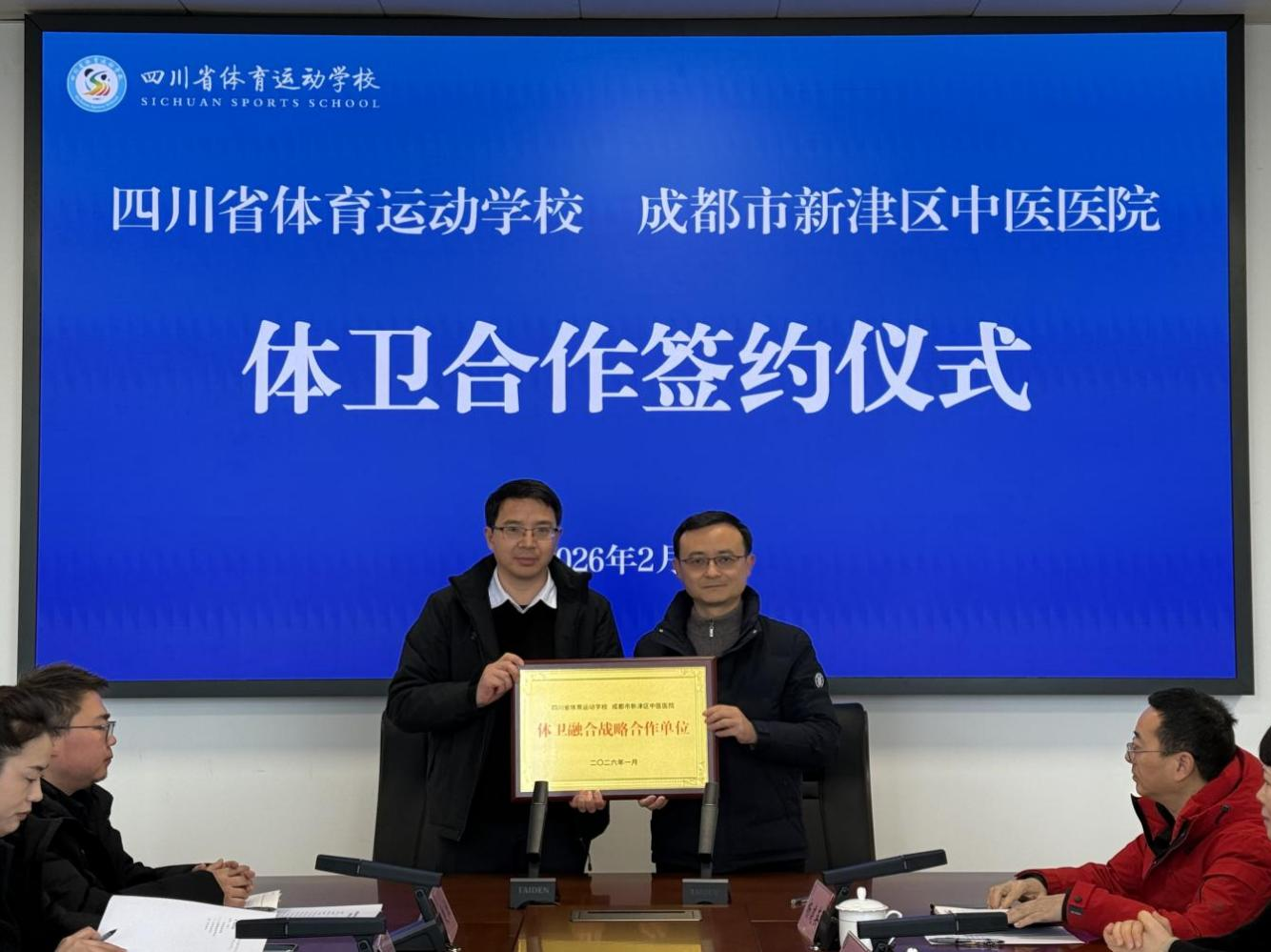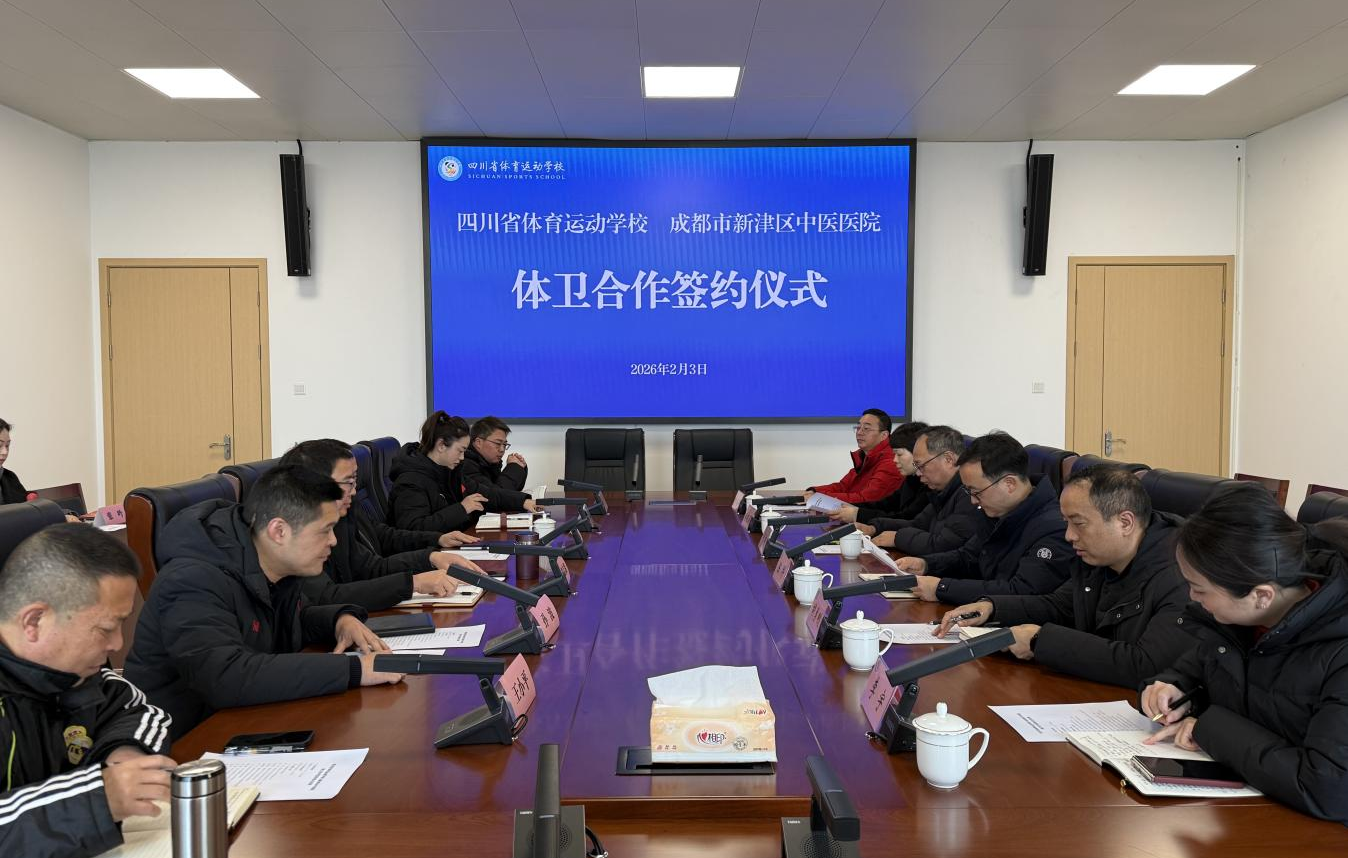 2026年2月3日上午,四川省体育运动学校与成都市新津区中医医院“体卫融合”战略合作协议签约仪式,在省体校思源楼五楼第二会议室举行。四川省体育运动学校党总支副书记、校长胡志鑫,副校长朱颖;成都市新津区中医医院党委书记张辉,院长陈科等双方单位领导及相关职能部门负责人共同出席仪式。