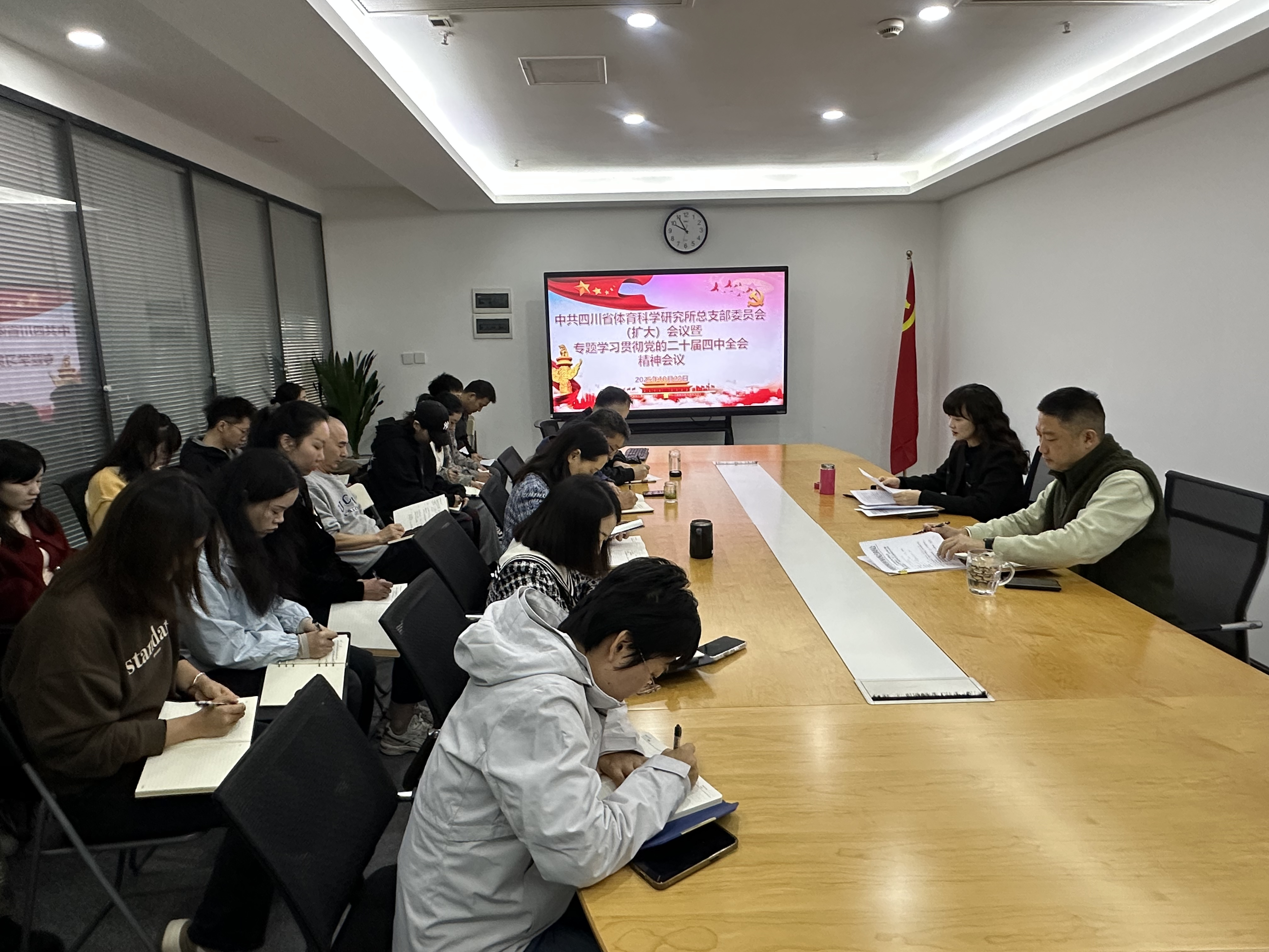 10月28日,省体科所召开党总支学习(扩大)会,专题学习党的二十届四中全会精神和省委常委会议有关精神,全体党员、干部职工参加会议。
