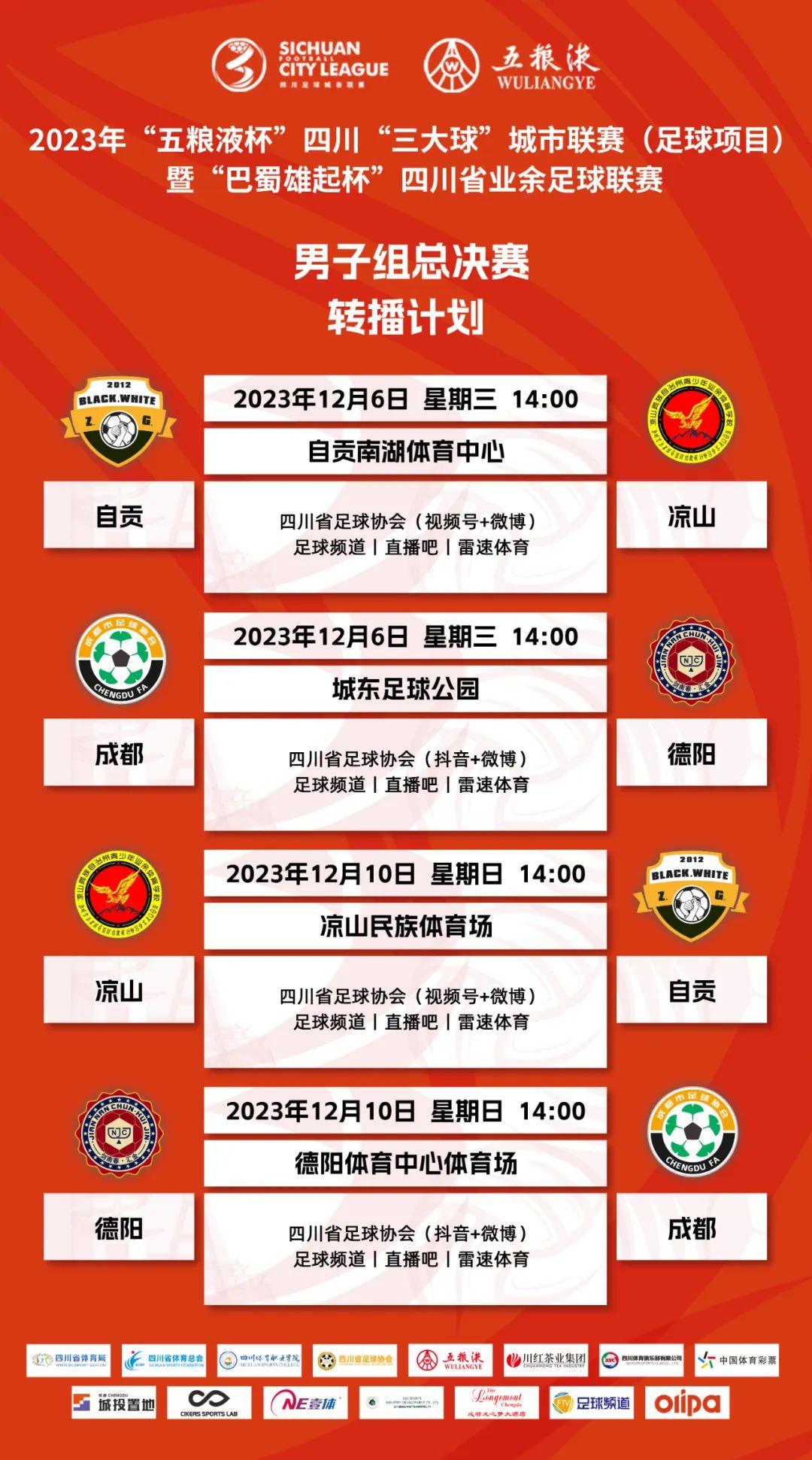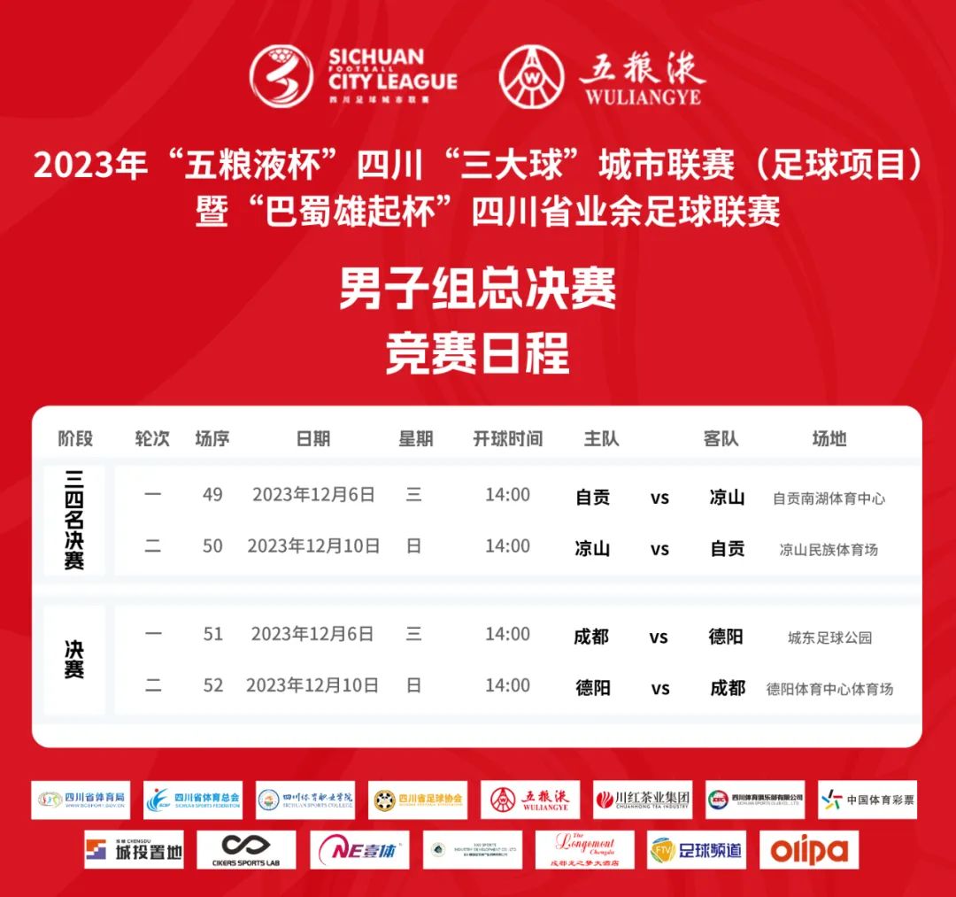 本次比赛将进行全程直播,广大观众朋友们可通过四川省足球协会官方微博、视频号、官方抖音,足球频道,直播吧,雷速体育观看赛事直播。12月10日14:00,男子组三四名决赛和决赛将进行次回合的比拼,冠亚季军也将产生,各位球迷朋友们敬请收看!