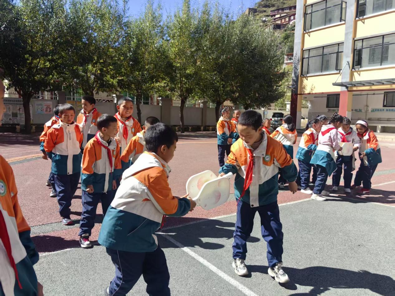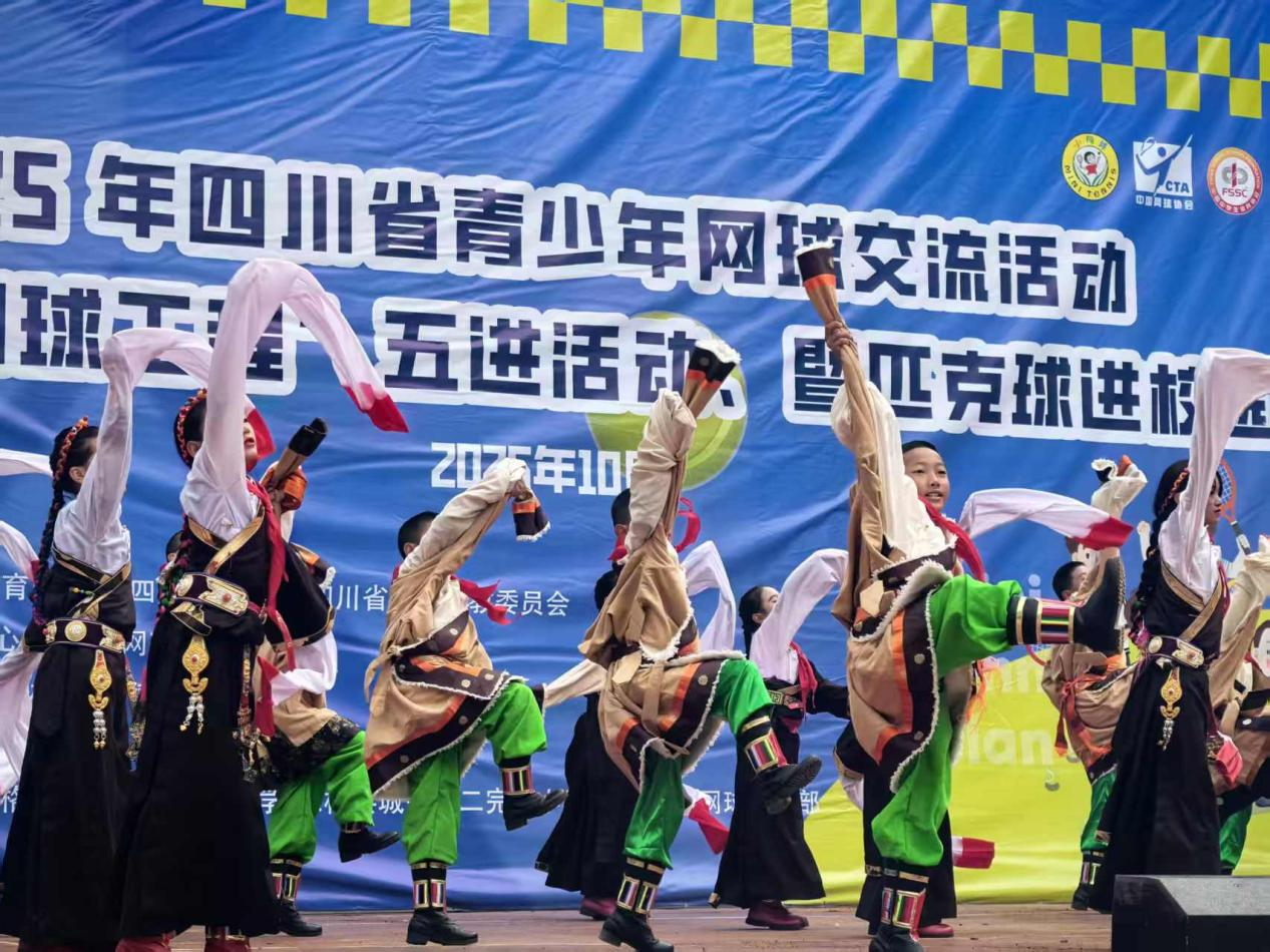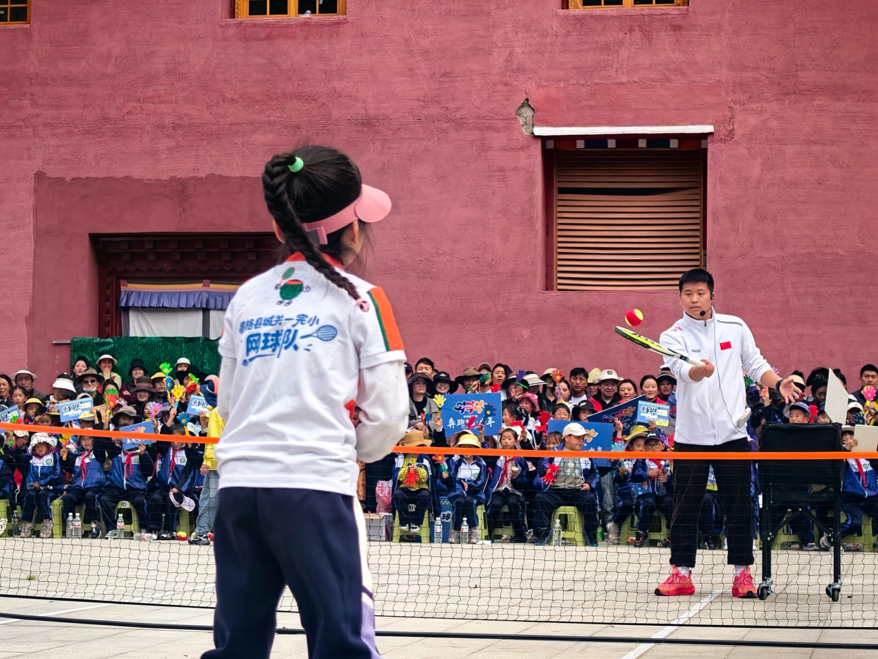 在海拔3200米的德格县城关二完小,两所小学的网球队员率先精彩亮相,通过汇报表演训练成果与正反手操,展现运动风采。