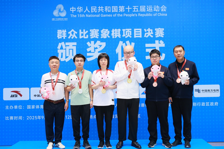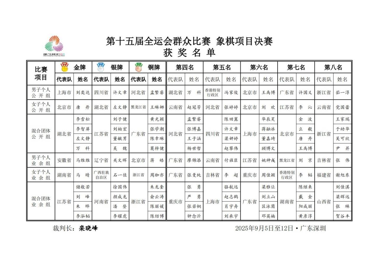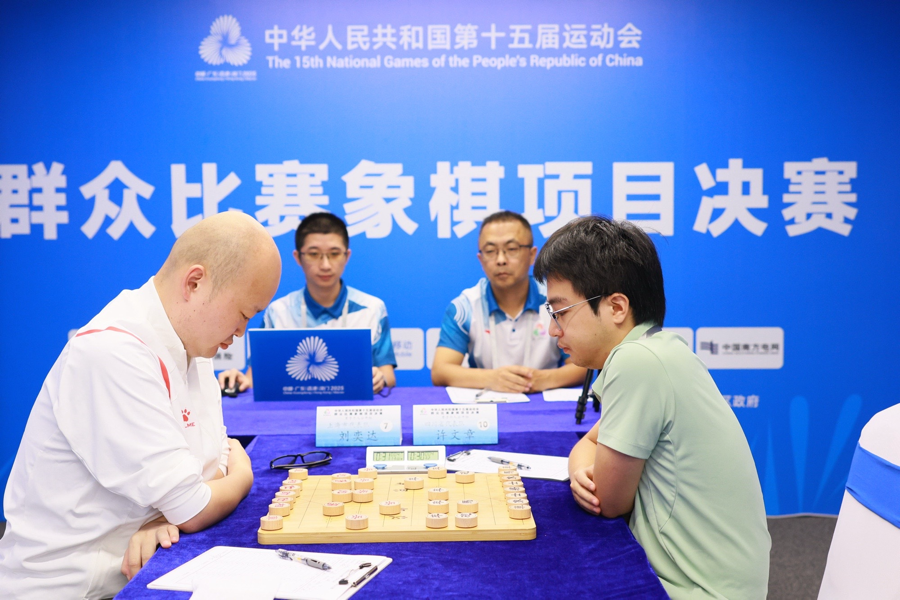 9月5日-12日,中华人民共和国第十五届运动会群众比赛象棋项目决赛在深圳市罗湖区举行。本次比赛设有男子个人公开组、女子个人公开组、混合团体公开组等6个组别,共有来自全国23个省(自治区、直辖市),香港、澳门特别行政区及1个行业体协的26支代表队,134名运动员同台竞技。比赛各组别均采用积分晋圈淘汰制,在5轮积分编排比赛后,前四名通过两轮淘汰赛决出最终冠军。
