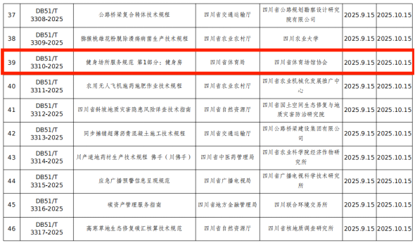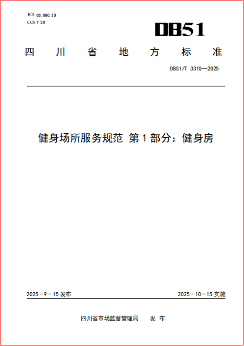 由四川省体育局归口管理、四川省体育场馆协会牵头编制的四川省地方标准《健身场所服务规范第1部分:健身房》经四川省市场监督管理局批准正式发布,并将于10月15日起正式实施。该标准是四川省首个规范健身房场所服务的地方标准。
