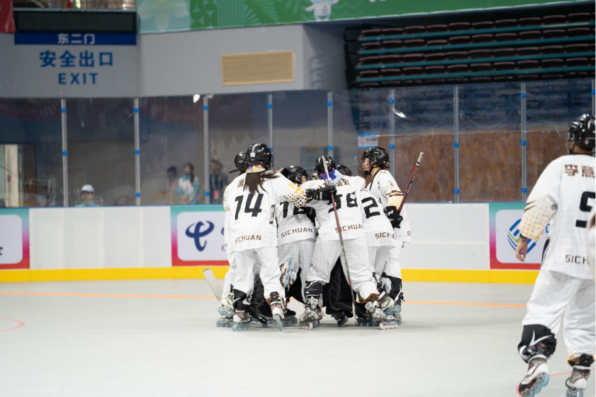 半决赛对阵老牌劲旅广东女队,面对强大的东道主,比赛局势更为胶着。在上半场,四川女队先声夺人,率先由副队长高艺涵首开纪录;广东女队迅速调整,凭借默契配合扳平比分。在下半场比赛中,四川女队及时调整战术,队长杨杨在乱局中寻得生机,攻入制胜一球,最终以2:1完成逆转绝杀,挺进决赛!决赛中,四川女队以4:1力克安徽女队获得金牌,终场哨响,姑娘们扔下球杆、紧紧相拥,以五战全胜之姿问鼎全运会单排轮滑球冠军!