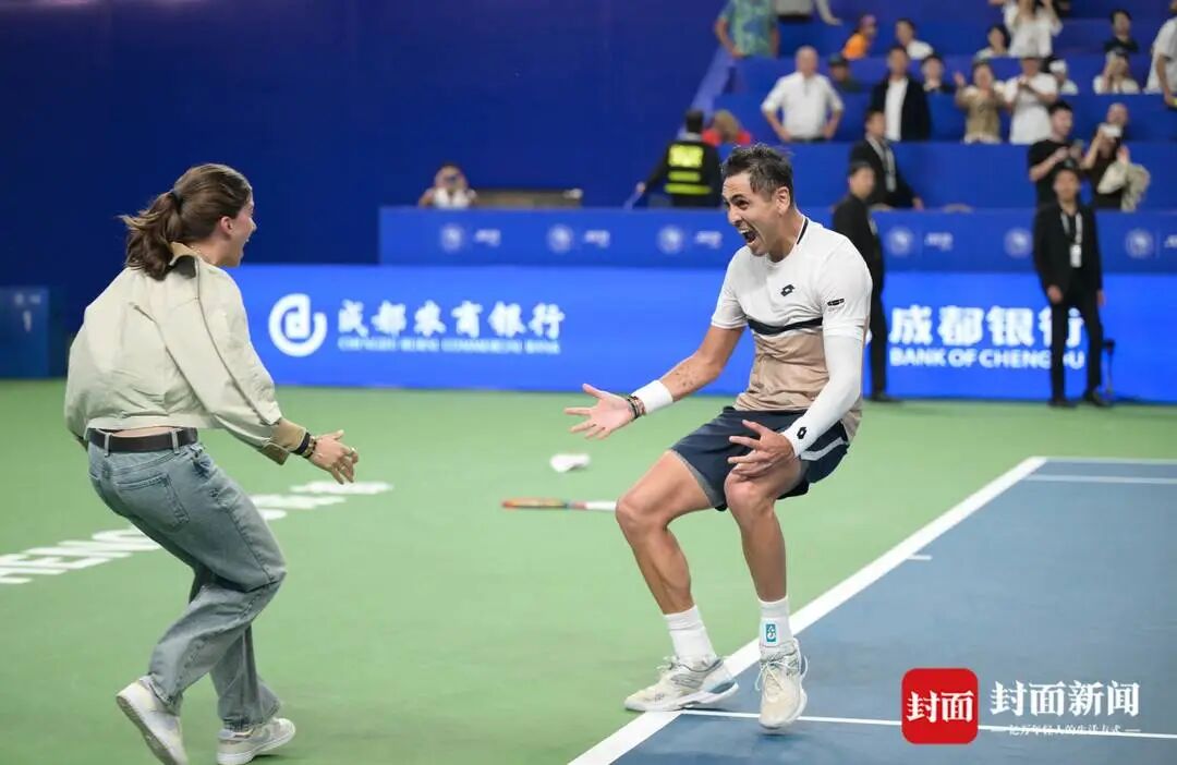 成都网球公开赛,“黑马”塔比洛夺冠后迎接冲进场内庆祝的女友