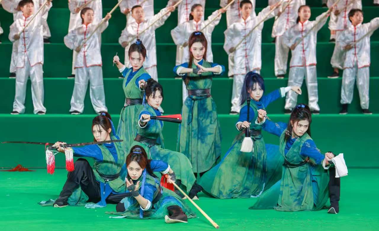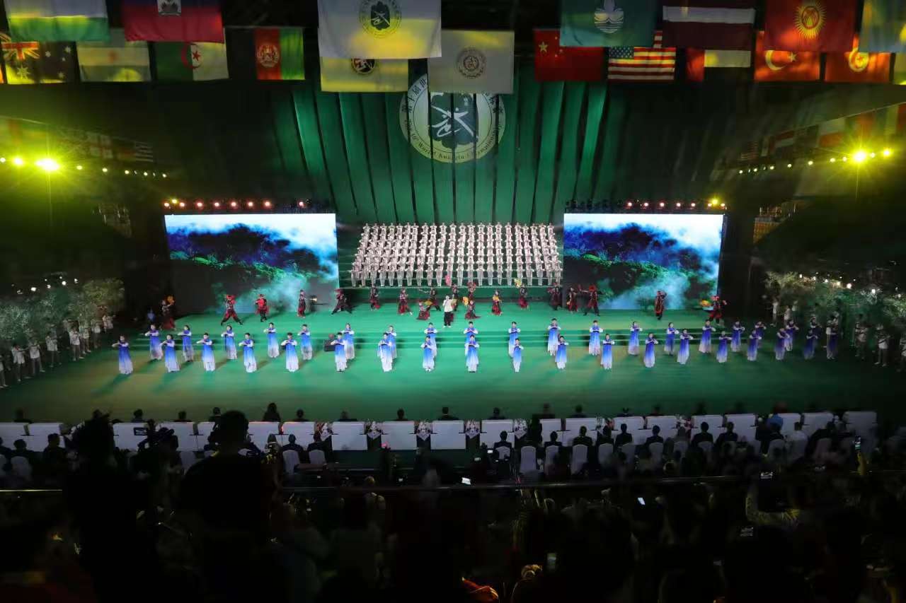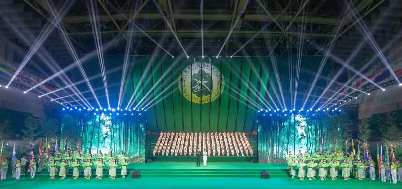 开幕式上,在气势恢宏的《茶武迎客》表演中,茶艺、武术与智能机器人同台演绎,展现中华传统文化与现代科技的精彩对话。峨眉派女子功夫团携手150多名演员带来的《复兴志·中国梦》、武术小演员与舞者共同呈现的《薪火相传》等精彩节目相继上演。在形象大使授牌仪式环节,国际武术联合会为在武术推广方面作出杰出贡献的李连杰、吴京二人颁发了荣誉奖项。同时,吴京作为国际武术联合会和中国武术协会新任命的武术形象大使,与李连杰完成了交接仪式。
