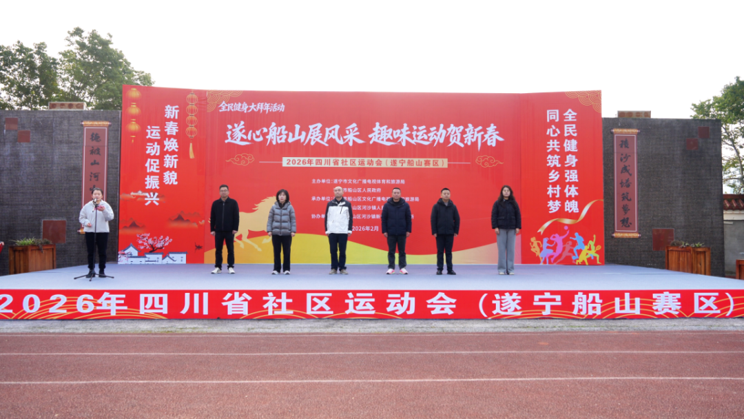 2月12日,由遂宁市文化广播电视体育和旅游局和遂宁市船山区人民政府主办的2026年全民健身大拜年活动暨四川省社区运动会遂宁赛区(船山站)在河沙镇栖凤村开幕。