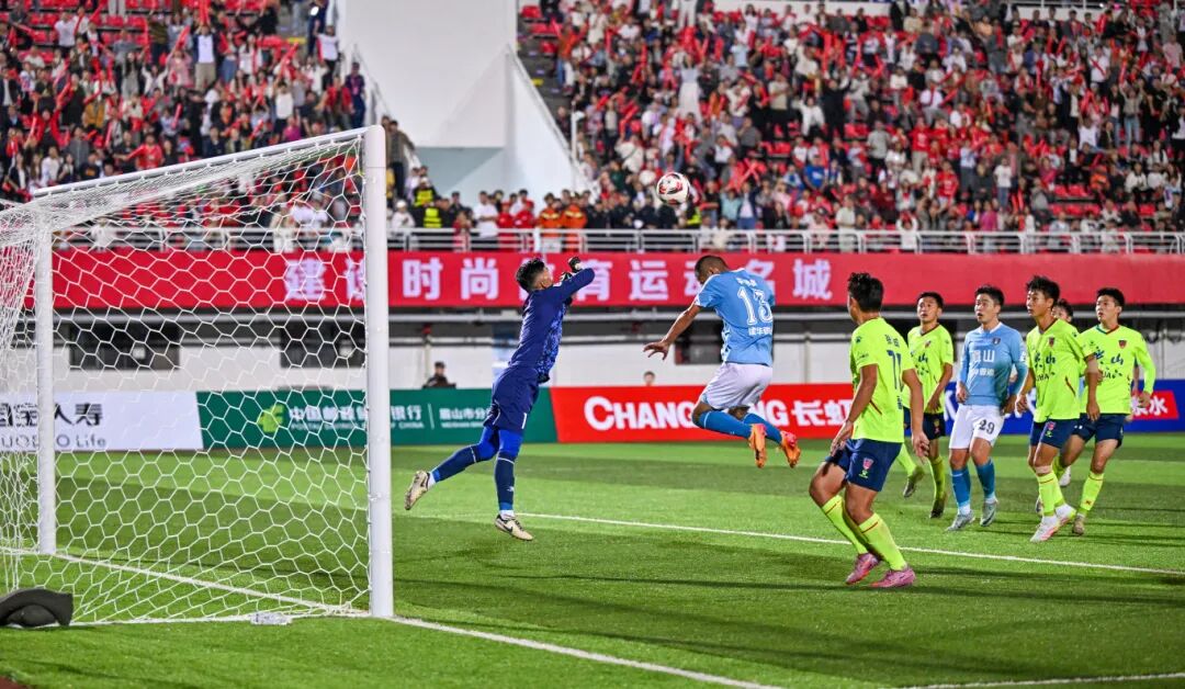 眉山队球员带球突破中场,红色阵营的呐喊声瞬间拔高分贝,有人激动起身,跟着球员的跑动轨迹挥舞手臂。每当两队球员在禁区前激烈拼抢,或守门员飞身扑出关键一球,整个赛场的声浪就会瞬间再掀高峰。