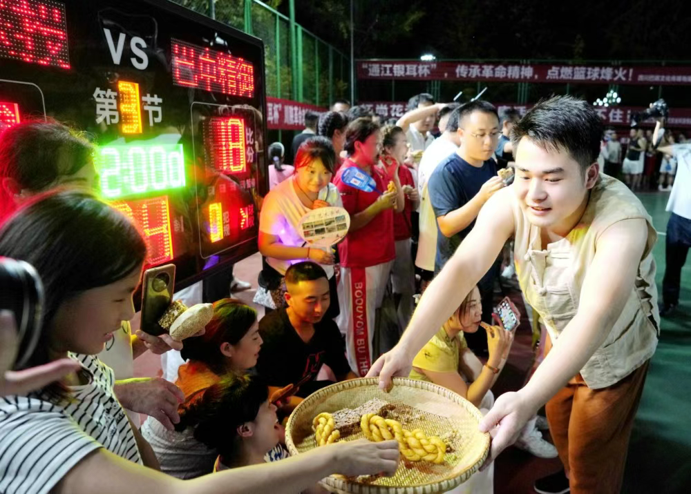 在离赛场2公里外的壁州廊桥市集内,通江剪纸、竹编等非遗商铺前围满观众,剪纸艺人以篮球赛为题材即兴创作,作品被抢购一空。