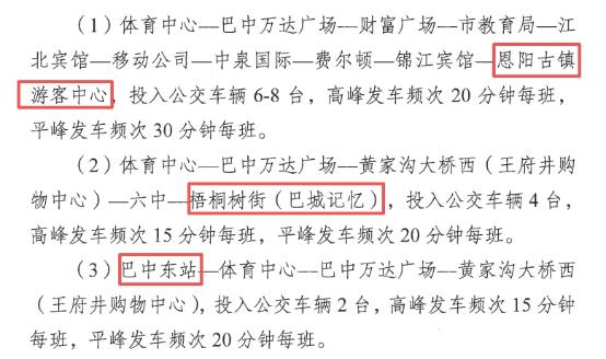 内 容:开通恩阳古镇—巴中市体育中心、巴城记忆—巴中市体育中心、巴中东站—巴中市体育中心3条免费公交专线,持工作证的参赛队员、裁判员及教练员,持巴中主场比赛票根的球迷和游客免费乘坐。