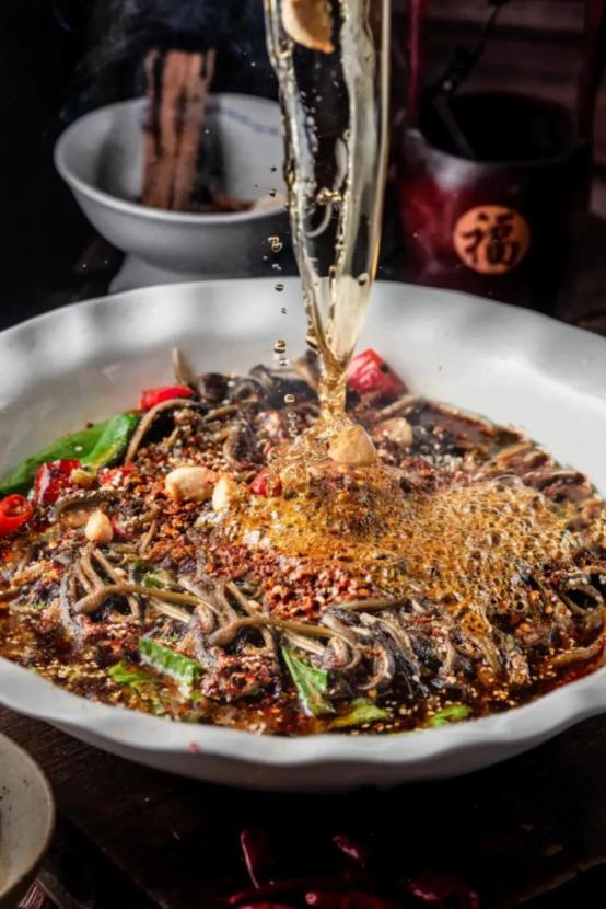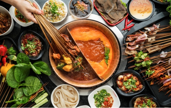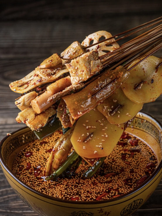 味道层次丰富,食材五花八门,在色泽浓郁的汤底中,放入穿在竹签上的麻辣牛肉、麻辣排骨、小郡肝等食材,边吃边烫,再配上秘制的蘸碟,根本停不下来!