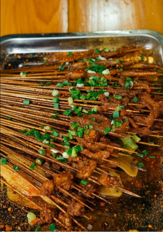 用新鲜的牛肉、五花肉、花菜、韭菜等食材用竹签串起来,通过秘制调料腌制后,经高温卤油炸制,卤油的香气就与食材的味道完美地融合在一起,外酥里嫩!