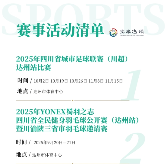 重点举行2025年四川省城市足球联赛“川超”达州站比赛、2025年四川省全民健身羽毛球公开赛(达州站)暨川渝陕三省市羽毛球邀请赛、2025年全国女子曲棍球锦标赛、2025年四川省广场舞大赛、2025年中国最美乡村路巴山大峡谷第三届自行车爬坡大师赛、2025年渠县半程马拉松暨跑遍四川、“渝来蜀往 大美竹乡”2025大竹县半程马拉松赛、达州东部经开区“真佛山·珍珑”杯四川省青少年围棋赛等精品赛事活动。