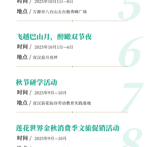 在巴山大峡谷重点举行2025年“月伴山海 梦回巴国”达州文旅秋游消费季启动仪式,发布系列促消费活动、产品、线路和政策等,拉开“秋游达州”序幕。还将举行通川区“畅游川渝陕·相约来通川”2025年国庆狂欢季暨文体商旅促消费活动、达川区2025年“国庆来达 川流不息”主题州河夜游系列活动、八台山国庆八天乐、月亮坪《飞越巴山月,醉瞰双节夜》活动、“荷香庆双节·七天乐不停”莲花世界国庆中秋文旅系列活动等。