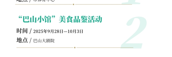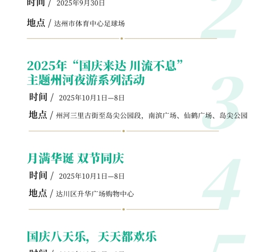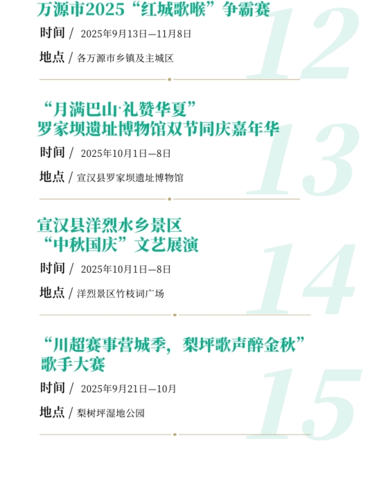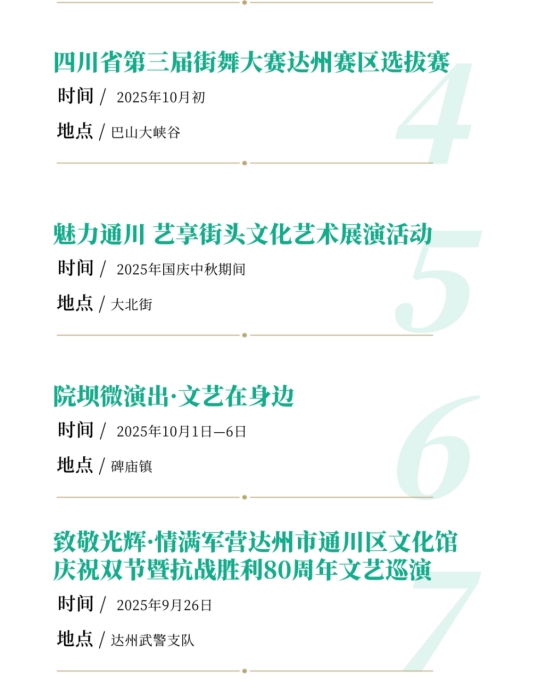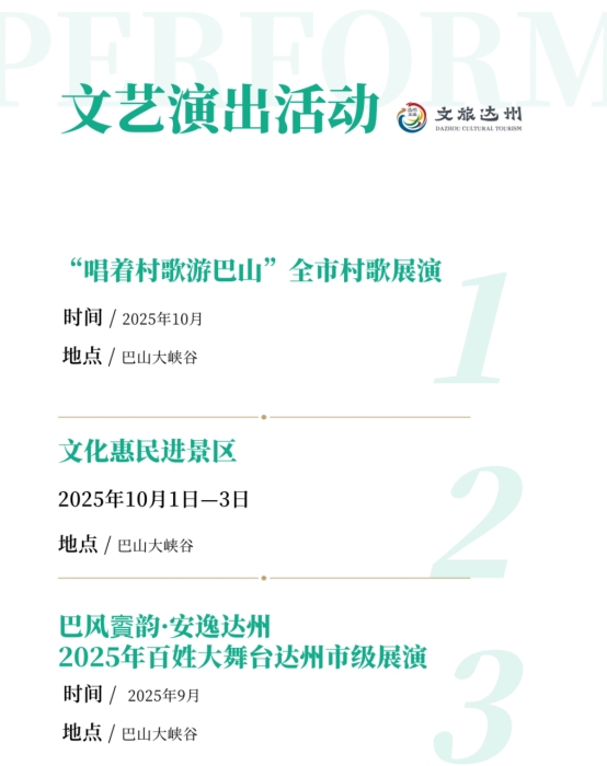 重点举行“唱着村歌游巴山”全市村歌展演、文化惠民进巴山大峡谷景区、“巴风賨韵•安逸达州” 2025年百姓大舞台达州市级展演、四川省第三届街舞大赛达州赛区选拔赛、“情满中秋欢度国庆”—2025年万人赏月诵中秋诗词朗诵会、“ 凤凰邀月·情满通川”通川区中秋赏月文艺活动、魅力通川·艺享街头文化艺术展演活动、院坝微演出•文艺在身边、致敬光辉•情满军营庆祝双节暨抗战胜利80周年文艺巡演、国庆7天乐·笑聚达川—笑扯剧场专场演出、三里古街•双节同庆嘉年华、桥影河畔庆双节、烽火战歌·声动万源—万源市2025“红城歌喉”争霸赛、“月满巴山·礼赞华夏”—罗家坝遗址博物馆双节同庆嘉年华、达州高新区“川超赛事营城季,梨坪歌声醉金秋” 歌手大赛等活动。