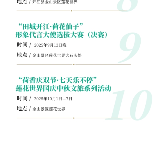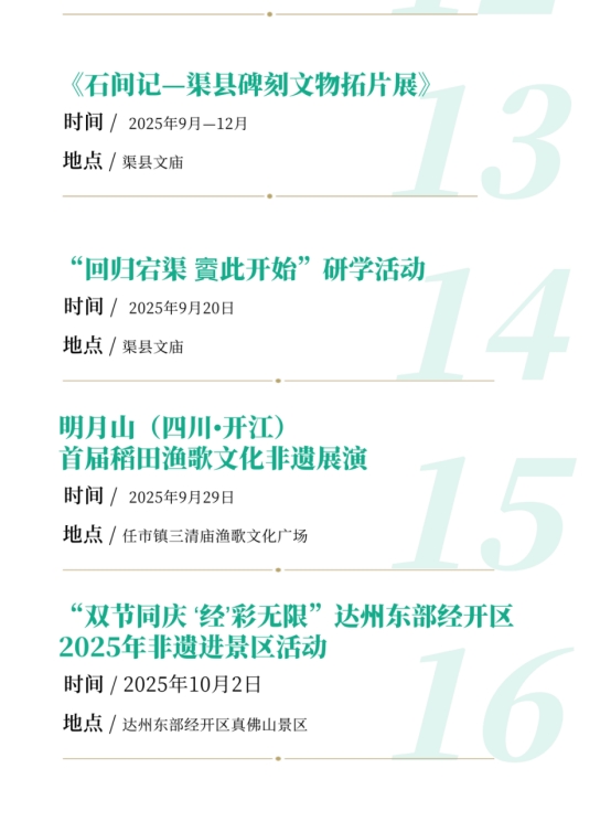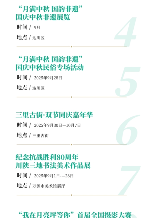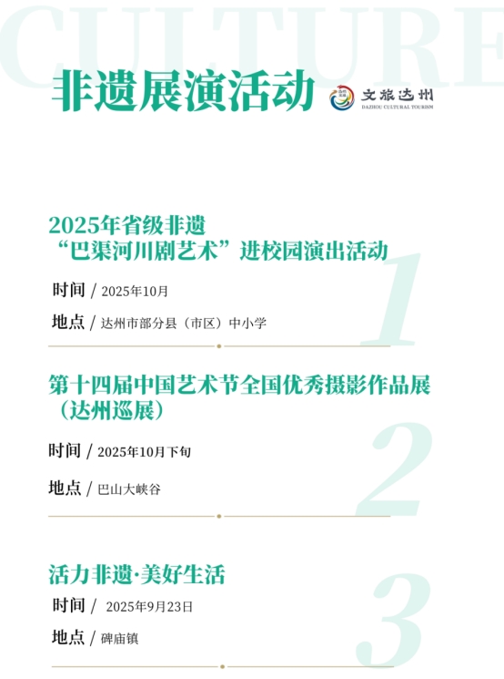 重点举行2025年省级非遗“巴渠河川剧艺术”进校园演出活动、通川区活力非遗·美好生活展示展览、达川区“月满中秋 国韵非遗”国庆中秋民俗专场和非遗展览、川渝非遗交流展演暨第十五届川东土家族薅草锣鼓赛歌会、宣汉县第十一届土家余门拳展演、渠县三汇彩亭庆国庆、明月山(四川•开江)首届稻田渔歌文化非遗展演、“双节同庆 ‘经’彩无限”达州东部经开区2025年非遗进景区等活动,以及第十四届中国艺术节全国优秀摄影作品展(达州巡展)、“我在月亮坪等你”首届全国摄影大赛、纪念抗战胜利80周年川陕三地书法美术作品展、宣汉县洋烈水乡景区“中秋国庆”书画摄影作品展、《石间记—渠县碑刻文物拓片展》等活动。