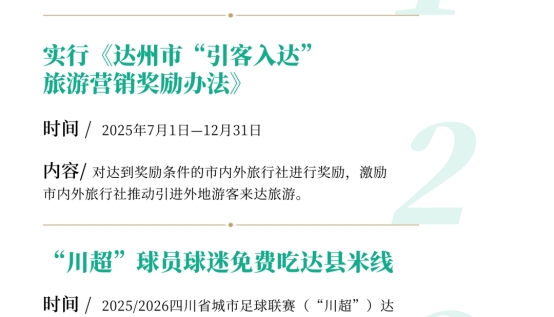 在“川超”达州主场赛事期间,对“川超”球员球迷实行免费吃达县米线、免巴山大峡谷景区门票(桃溪谷门票+大象洞门票),市外牌照车辆免费停车的“三免”福利,吸引外地游客来达观赛旅游。推出住宿餐饮优惠措施,根据赛事时间延长营业时间,策划一批“凭票折扣”“消费满减”等让利活动,设置球迷用餐专区,量身打造“球迷专属套餐”“延时退房”等优惠活动,联动周边餐饮、景点推出消费折扣。定向发放市本级文体旅游消费券支持巴山大峡谷景区套票、索道、演艺、滑雪等产品,助力巴山大峡谷创建国家5A级旅游景区。推出“川超”达州站比赛期间旅游景区优惠措施。实施“引客入达”旅游营销奖励办法,对符合条件的市内外组织市外游客来达旅游的旅行社、在市外宣传推广达州文旅资源产品的市内旅行社进行奖励。