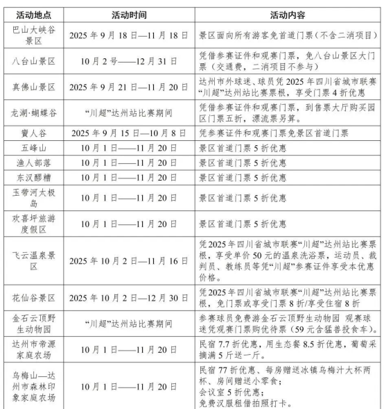 内 容:游客提供购买2025/2026四川省城市足球联赛的门票、参赛队员、裁判员及教练员持工作证到全市相应的酒店民宿享美团、携程等线上平台挂牌价的10%优惠,到景区享门票免票、半价优惠,到旅行社享受1-5日游每人每天优惠10元、6-10日游每人每天优惠15元。