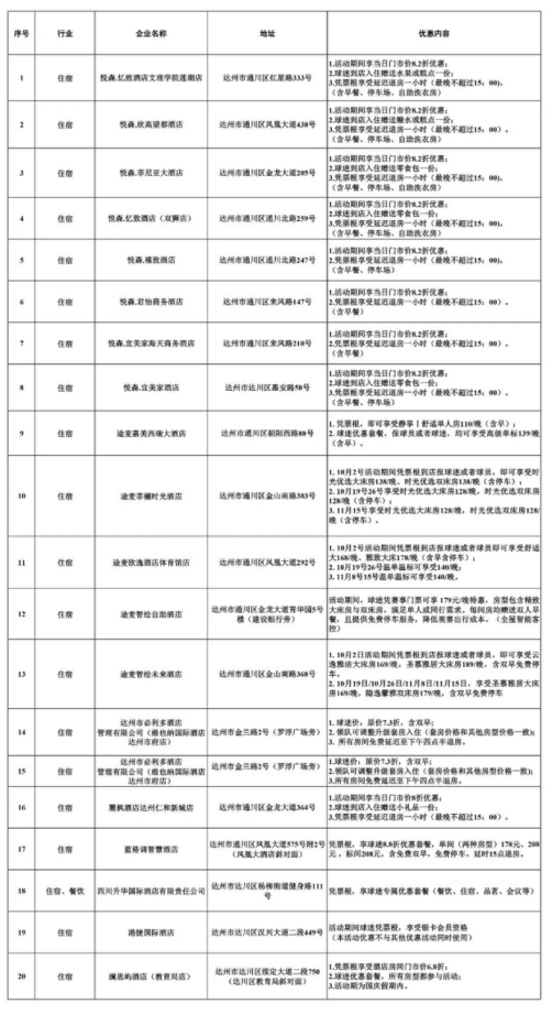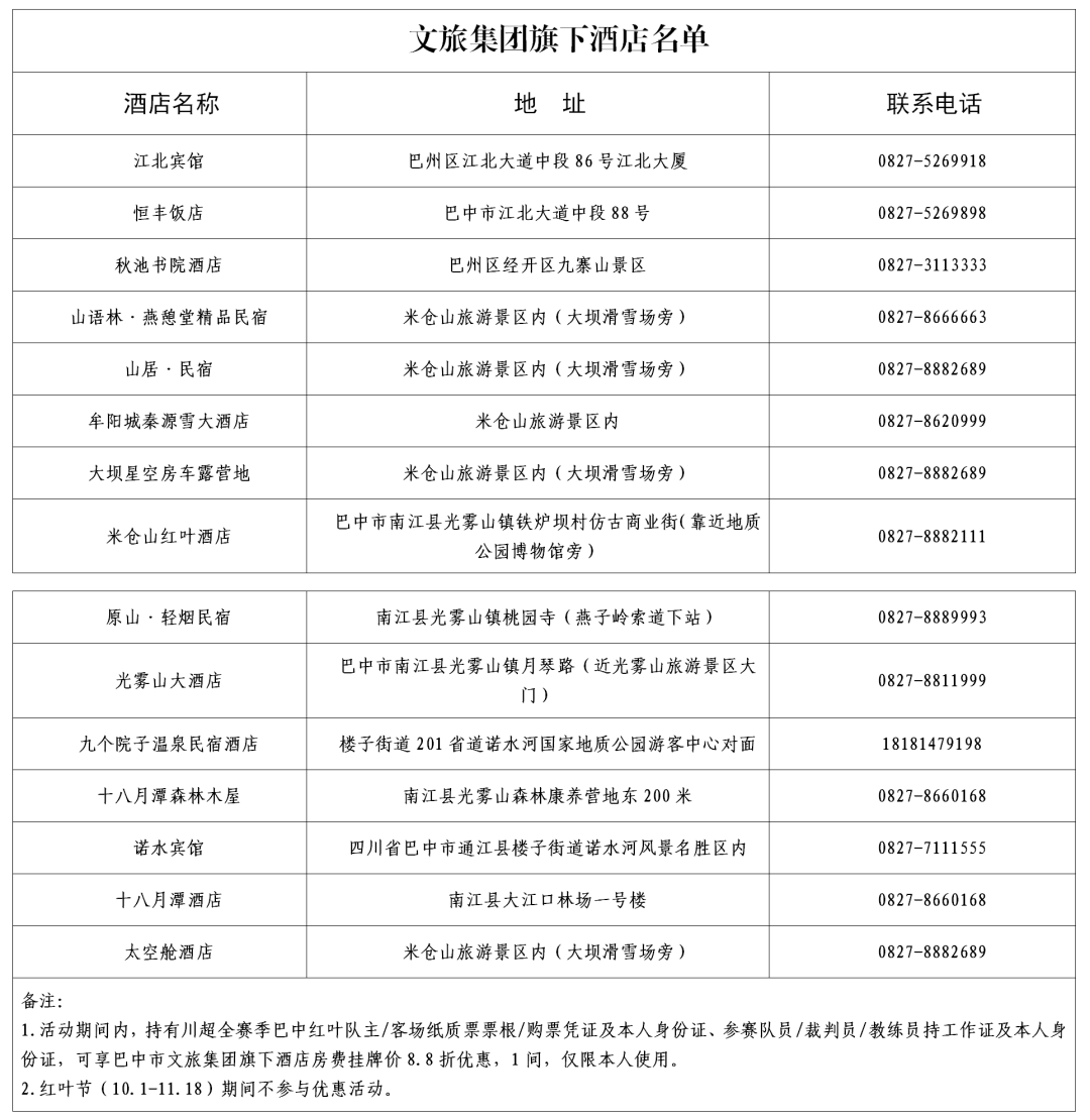 内 容:在川超联赛全赛季期间,持有巴中红叶队主/客场纸质票票根(或购票凭证)及本人身份证的球迷,以及持有效工作证及本人身份证的参赛队员、裁判员、教练员,可享巴中市文旅集团旗下酒店房费挂牌价8.8折优惠(1间,需提前预约,仅限本人入住)。