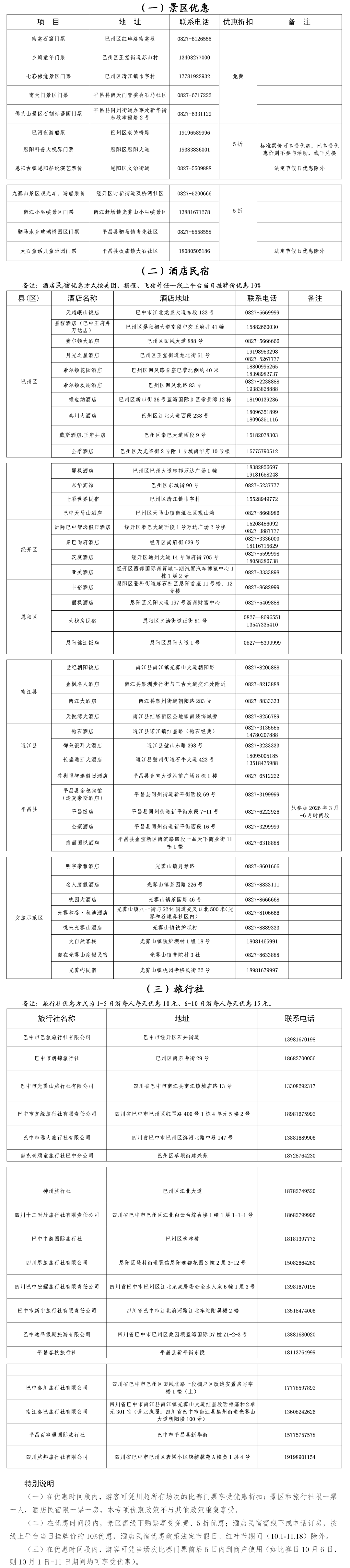 内 容:在川超联赛全赛季期间,持有巴中红叶队主/客场纸质票票根(或购票凭证)及本人身份证的球迷,以及持有效工作证及本人身份证的参赛队员、裁判员、教练员,参与由市文旅集团合作旅行社推出的光雾山、诺水河或巴中全域旅游产品,可享受6折优惠。旅行社联系方式:13778791085(郑女士)、18980293724(何女士)