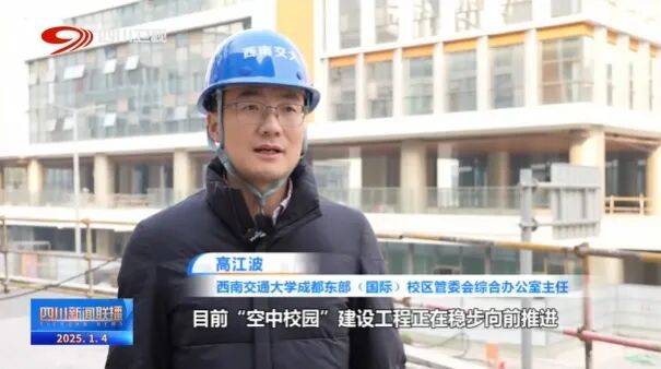 西南交通大学成都东部(国际)校区管委会综合办公室主任 高江波:目前“空中校园”建设工程正在稳步向前推进,预计(今年)3月份迎来竣工交付,7月份西南交大智慧城市与交通学院的首批师生就将搬迁入驻,按照办学的节点,9月份校园正式启用办学。